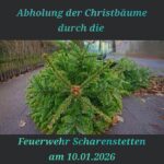 - Wer seinen Christbaum unkompliziert los werden möchten, stellt ihn am 10. Januar einfach ab 8 Uhr abgeschmückt an den Gehweg. Die Freiwillige Feuerwehr Scharenstetten holt ihn dann ab, wer eine Spende geben will befestigt dazu einfach eine kleine Tüte mit Geld am Baum. Vielen Dank im Voraus eure Kameraden der FFW 🚒 #FreiwilligeFeuerwehrScharenstetten #dorfleben #zusammenhalt