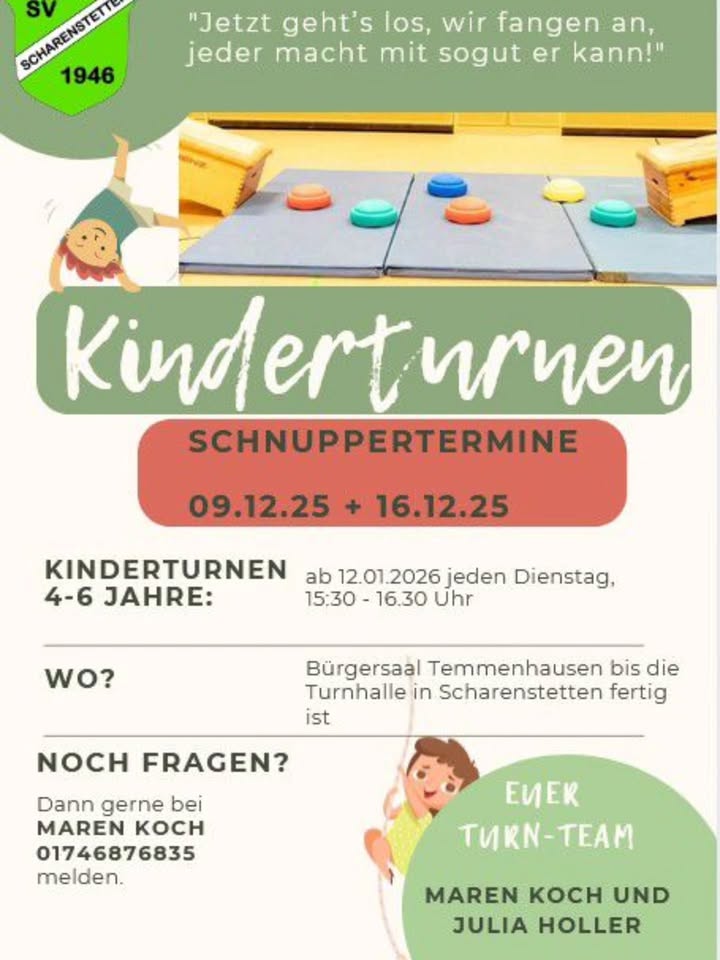 Kinderturnen Schnuppertermine SV Scharenstetten 09.12.2025 und 16.12.2025 #sportvereinscharenstetten #kinderturnen #dorfleben