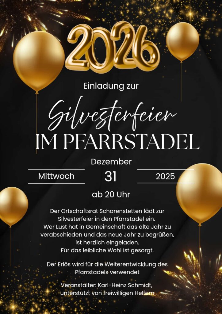 Der Ortschaftsrat Scharenstetten lädt an Silvester 2026 in den Pfarrstadl – organisiert von Karlheinz-Schmidt (Partyservice Fern-Bedienung https://www.fern-bedienung.de/).